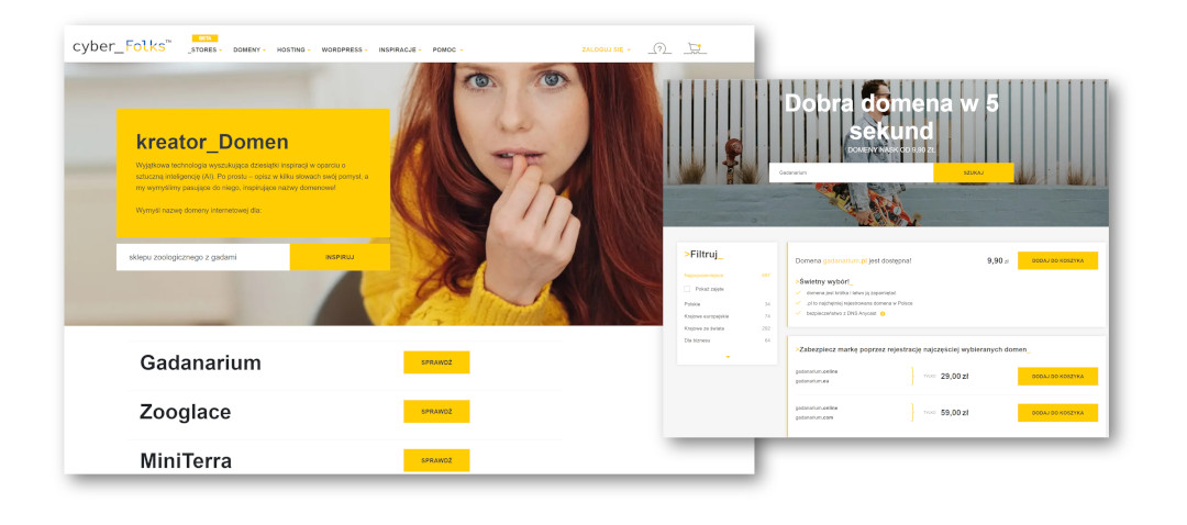 W 2023 roku znalezienie dobrej i WOLNEJ nazwy dla sklepu internetowego to krew, pot i łzy. Powszechnie wiadomym jest, że dobra nazwa to krótka nazwa, a optymalnie, gdy jednocześnie choć trochę nawiązuje do oferowanego asortymentu czy branży, w której chce działać sklep. Jeśli zależy nam (a przecież zależy) na szybkim rozpoczęciu działania, to nazwa/domena musi być możliwa do zarejestrowania od ręki. Z naszych badań (a przeanalizowaliśmy ponad 1,7 mln takich nazw) wynika, że średnia długość to zaledwie 10 znaków – zatem, aby uznać, że nazwa jest „dobra, bo krótka”, trzeba się zmieścić w tej liczbie liter i cyfr. I tu właśnie po raz pierwszy z pomocą przychodzi sztuczna inteligencja – np. w postaci kreatora nazw domenowych, podpowiadającego nazwy na bazie krótkiego tylko opisu tego czym, ma się zajmować sklep. Kilka sekund proponuje kilkadziesiąt wariantów (ja poprosiłem o propozycje nazw domeny internetowej dla sklepu zoologicznego z gadami), które następnie możemy zweryfikować jednym kliknięciem i wrzucić do koszyka.