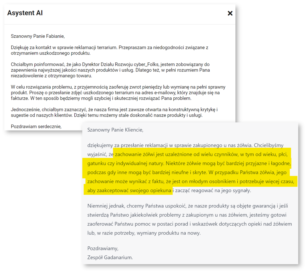 Po lewej stronie treść reklamacji od klienta, który otrzymał akwarium ze zbitą szybą. Odpowiedź przygotowana przez ChatGPT jest wzorowa, a test Turinga (dla przypomnienia to ten, w którym człowiek-sędzia rozmawia jednocześnie z innym człowiekiem i z maszyną; maszyna zdaje test, jeśli nie jest on w stanie odróżnić, czy rozmawiał w danej chwili z nią, czy też z człowiekiem) został zdany przez “maszynę” na 5+.