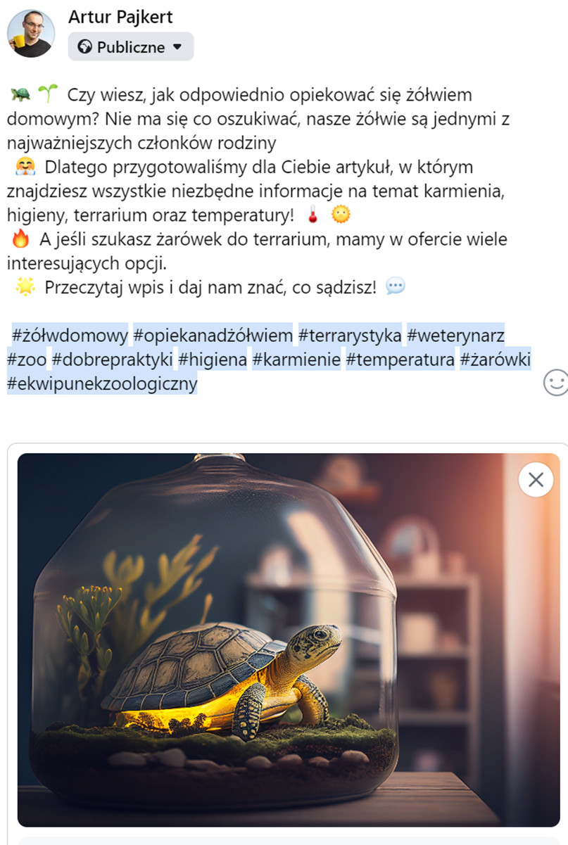 Teraz powtórzyłem to ćwiczenie z postem na profilu sklepu z żółwiami, ale dodatkowo postanowiłem jeszcze zanurkować w morzu hasztagów. Sprawdziłem to na Facebooku i okazało się, że z jedenastu zaproponowanych przez ChatGPT, tak naprawdę trzy potencjalnie mogłyby mieć sens – bo umówmy się, ciężko jest promować sprzedaż żółwi i terrarium pod hashtagiem higiena czy karmienie.