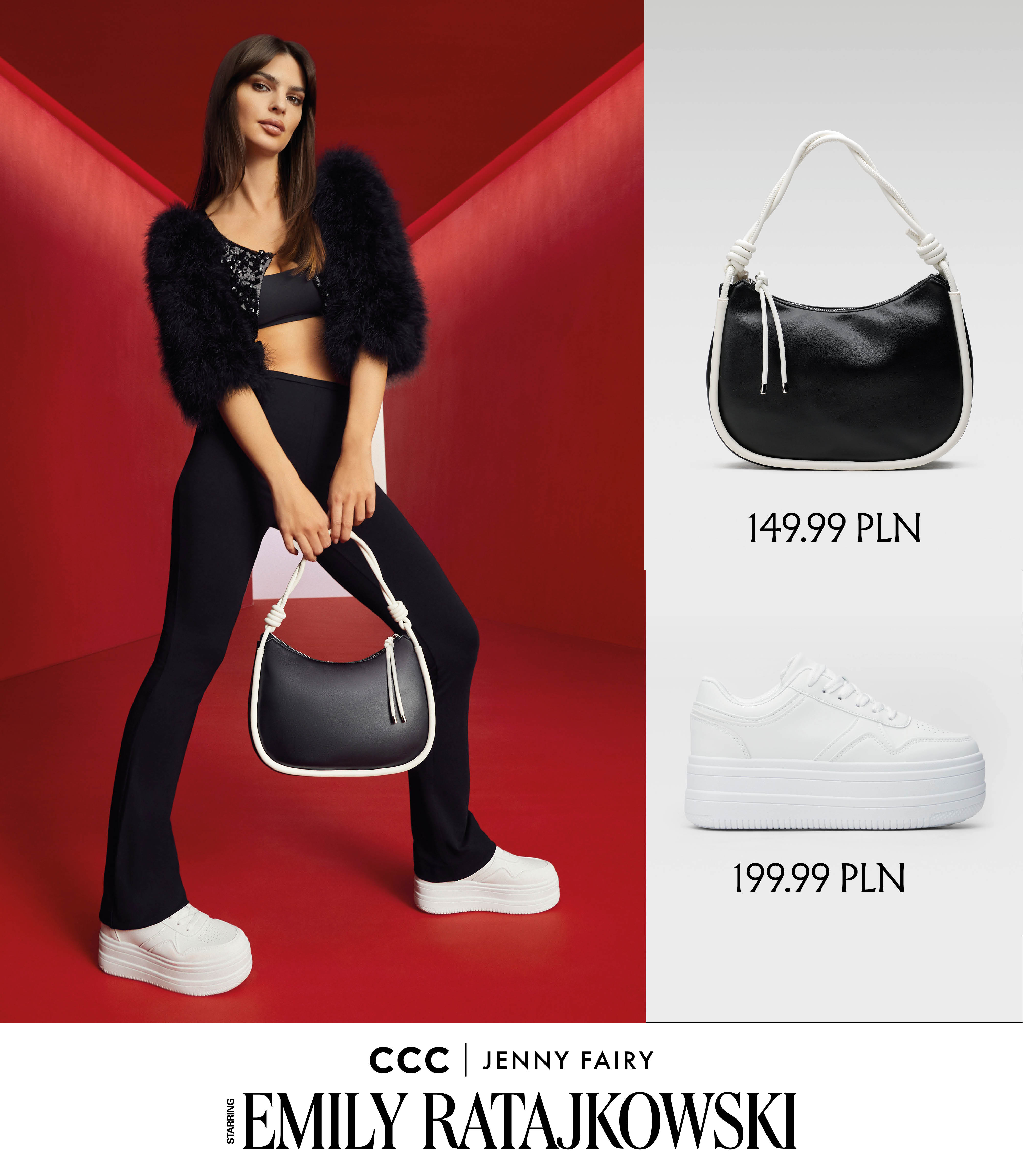 Przeciwieństwa się przyciągają? Oui! Czerń i biel w duecie to jedno z najmodniejszych zestawień kolorystycznych tego sezonu. Czarny total look w którym pojawia się Emily Ratajkowski, został przełamany stylowymi, białymi flatformami w klimacie lat 90. Kontrastująca midi torebka marki Jenny Fairy idealnie dopełnia to zestawienie!