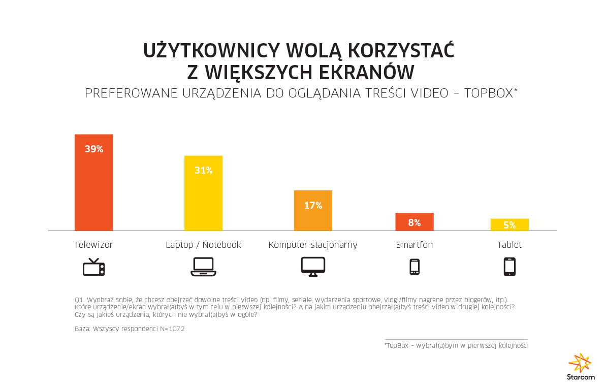 Telewizor jako urządzenie pierwszego wyboru, niezależnie od rodzaju formatu wideo, wskazało 39 proc. respondentów. 31 proc. wskazań zebrał laptop/notebook, 17 proc. komputer stacjonarny, a tylko 8 proc. smartfon.