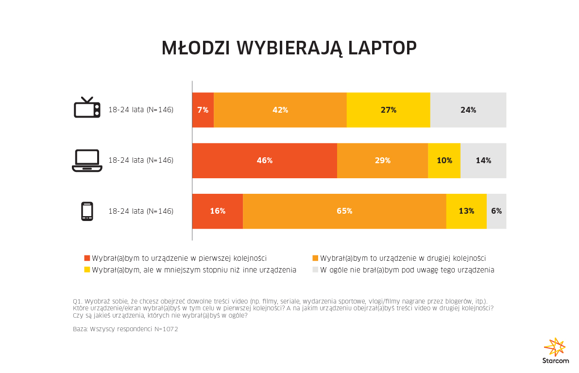 Wybór urządzenia różni się jednak w zależności od wieku respondentów. Wśród osób w wieku 18-24 lata zdecydowanie dominuje laptop. Jako urządzenie pierwszego wyboru wskazało go 46 proc. respondentów, podczas gdy telewizor wybrało 7 proc. badanych, a smartfon 16 proc. – Warto zauważyć, że choć niewiele osób wskazało smartfon jako ekran pierwszego wyboru, pełnią one ważną rolę jako jego alternatywa. Taką rolę przypisało im aż 65 proc. ankietowanych, co nie dziwi, biorąc pod uwagę to, że znaczna część konsumpcji video na telefonach odbywa się poza domem, czyli również poza dostępem do ekranu preferowanego, jakim wśród młodszych pozostaje laptop – mówi Sebastian Szade, Strategy & Innovation Director w Starcomie.