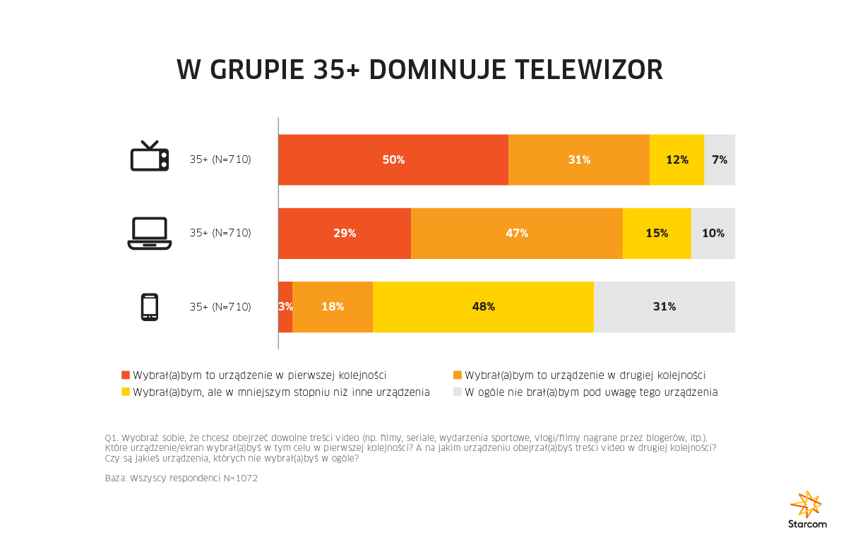 Wśród starszych odbiorców (powyżej 35 roku życia) proporcje się odwracają. Telewizor jest urządzeniem pierwszego wyboru. Wskazało go 50 proc. badanych, laptop wybrało 29 proc. respondentów, a smartfon zaledwie 3 proc. – W tym segmencie wiekowym smartfony tracą pozycję ekranu drugiego wyboru. Taką rolę przypisuje im tylko 18% respondentów – mówi Szade.