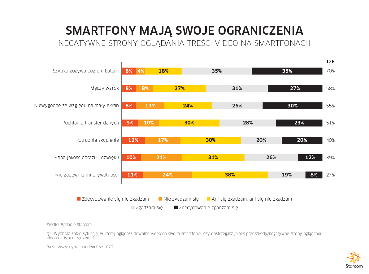 Powody, dla których smartfon nie jest urządzeniem preferowanym przez użytkowników jeśli chodzi o korzystanie z treści wideo, tkwią w wygodzie oglądania. Respondenci jako główne bariery wskazali: szybkość zużywania baterii, męczenie wzroku, zbyt mały ekran, wysoki pobór danych oraz trudności w skupieniu. – Warto podkreślić, że większość kluczowych barier wskazanych przez respondentów to ograniczenia wynikające ze specyfiki samego urządzenia, a więc, bardzo trudne do pokonania, co może stanowić istotną przeszkodę do dalszego rozwoju video w segmencie mobile, ale również, może być przydatną wskazówką co do tego, jakie treści powinny tam trafiać w pierwszej kolejności. – dodaje Szade.