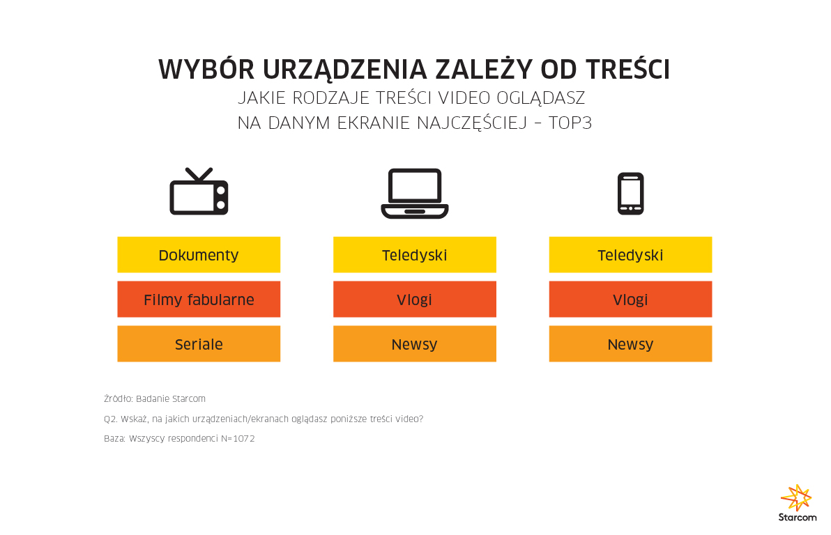 Wybór urządzenia do oglądania wideo jest skorelowany z rodzajem treści, którymi zainteresowani są odbiorcy. Dłuższe formaty takie jak filmy, seriale czy dokumenty, chętniej oglądane są na największym ekranie jakim jest telewizor. Laptopy i smartfony częściej służą do przeglądania teledysków, vlogów i materiałów newsowych.