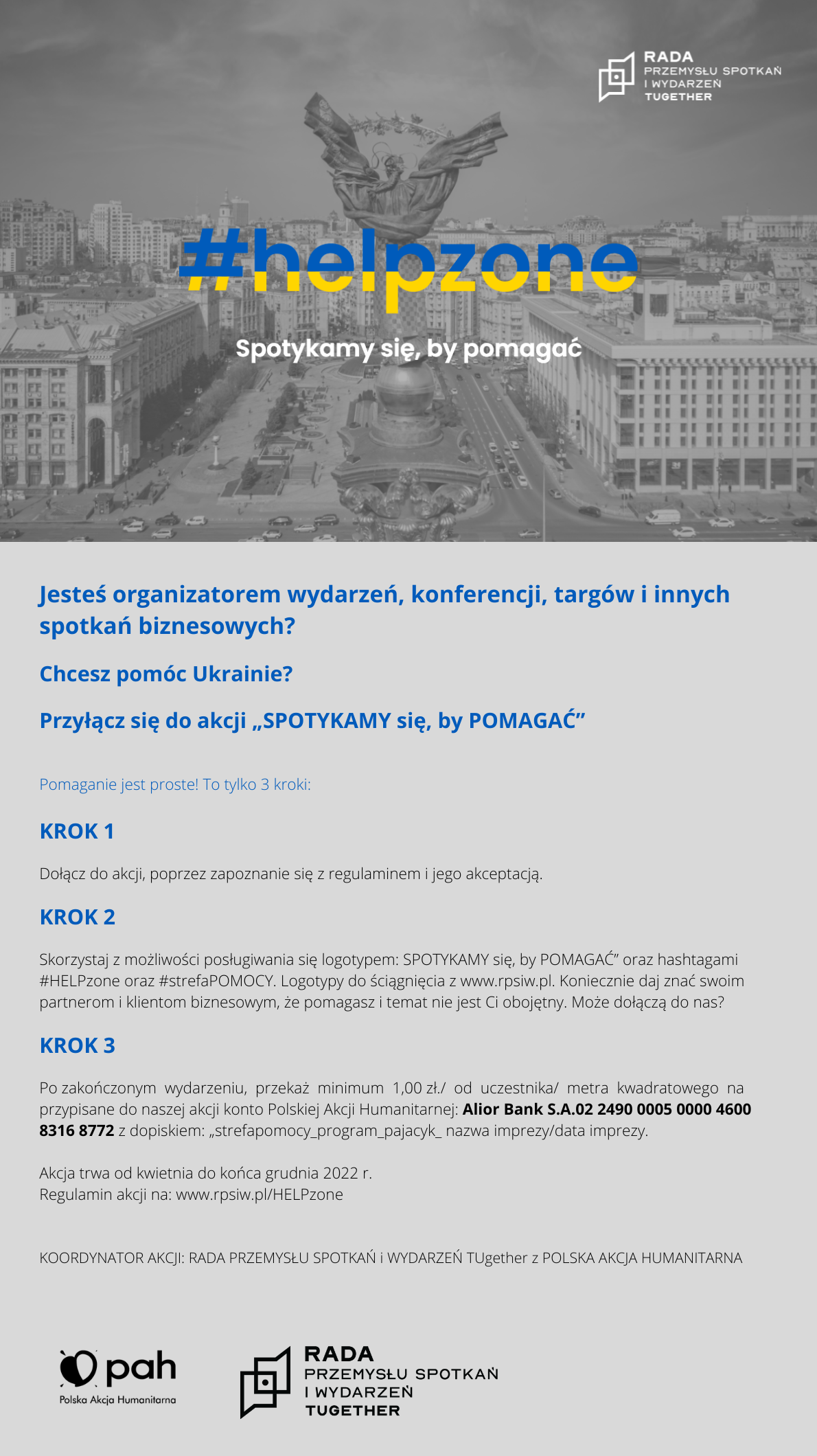 Celem akcji jest ponadto uświadomienie klientom biznesowym i uczestnikom wydarzeń, że realizacja spotkań firmowych, wyjazdów, konferencji, targów, czy udział w wydarzeniach sportowych i kulturalno-rozrywkowych mogą odgrywać wielką rolę w łańcuchu pomocowym dla uchodźców z Ukrainy i w tym trudnym czasie nie można z nich rezygnować. Obecna sytuacja za wschodnimi granicami Polski nie powinna dodatkowo obciążać kondycji sektora spotkań i wydarzeń, a realizacja spotkań firmowych, wyjazdów, konferencji, targów, czy udział w wydarzeniach sportowych i kulturalno-rozrywkowych mogą być wykorzystane do pomocy uchodźcom z Ukrainy.