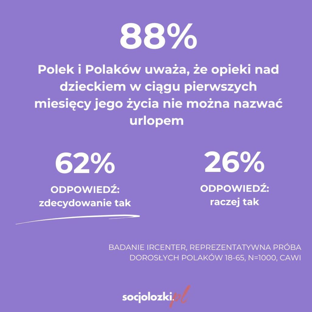 Aż 88 proc. Polek i Polaków przyznaje, że opieki nad dzieckiem w ciągu pierwszych miesięcy jego życia nie można nazwać urlopem, a zdaniem 46 proc. określenie „urlop macierzyński” jest lekceważące w stosunku do wykonywanych w tym czasie zajęć. Spośród badanych kobiet uważa tak 55 proc., podczas gdy wśród mężczyzn tylko 36 proc. To dane z badania na reprezentatywnej próbie Polaków przeprowadzonego w ramach akcji Sukcesu Pisanego Szminką, mającej na celu zmianę sformułowania „urlop macierzyński / rodzicielski / ojcowski” na „przerwa macierzyńska / rodzicielska / ojcowska”. Badanie przeprowadziły wspierające akcję twórczynie inicjatywy Socjolożki.pl, Dorota Peretiatkowicz i Katarzyna Krzywicka Zdunek.