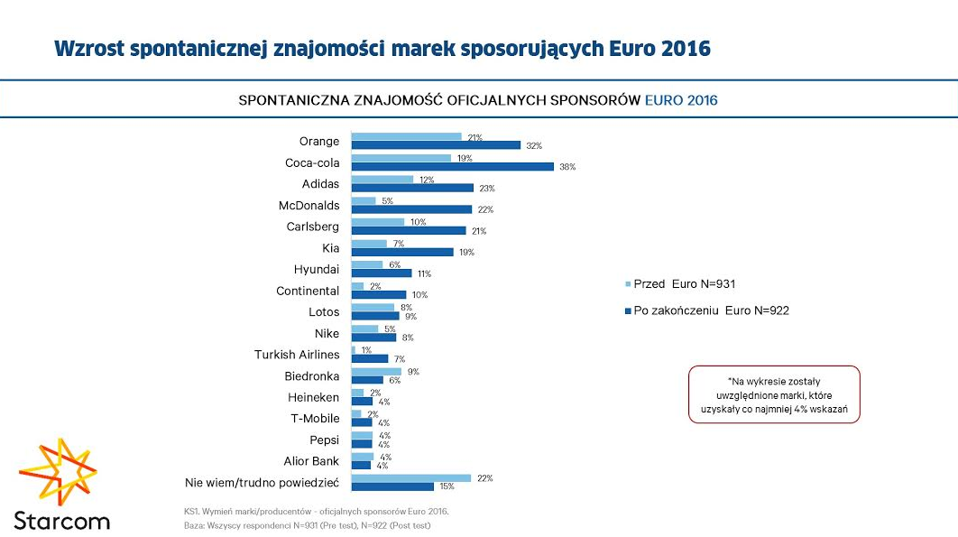 W porównaniu z okresem przed rozpoczęciem mistrzostw z 22 do 15 proc. spadł odsetek osób, które nie są w stanie spontanicznie wymienić żadnego z dziesięciu oficjalnych sponsorów Euro 2016 (Coca-Cola, Orange, Kia, Hyundai, Adidas, Carlsberg, McDonalds, Turkish Airlines, Continental, Hisense, Socar). Najwięcej wskazań zebrała marka Coca Cola (38 proc.), która może też się pochwalić najwyższym wzrostem w stosunku do okresu sprzed mistrzostw, następnie Orange (32 proc.), Adidas (23 proc.), McDonald’s (22 proc.), Carlsberg (21 proc.) oraz Kia (19 proc.). Na dalszych miejscach znalazły się: Hyundai (11 proc.), Continental (10 proc.) oraz Turkish Airlines (7%).