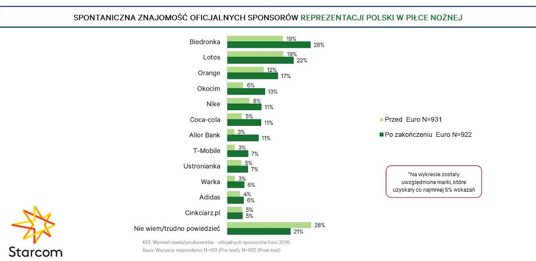 Słabiej niż oficjalnych sponsorów Euro 2016 Polacy kojarzą sponsorów naszej reprezentacji, choć i w tym wypadku odsetek respondentów, którzy nie byli w stanie spontanicznie wymienić żadnej marki był niższy niż przed imprezą (21 proc. wobec 28 proc.). Najczęściej przywoływanymi markami były Biedronka (28 proc.) oraz Lotos (22 proc.). Na trzecim miejscu nieoczekiwanie znalazł się Orange (17 proc.), który od ponad dwóch lat nie jest związany z reprezentacją Polski, jest natomiast w gronie oficjalnych mecenasów UEFA.