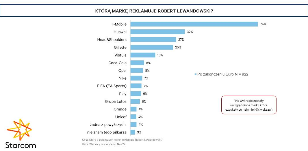 Przy okazji każdej mistrzowskiej imprezy obok kampanii oficjalnych sponsorów reklamodawcy inwestują w działania wykorzystujące wizerunek bohaterów piłkarskich aren. Nie inaczej było przed i w trakcie Euro 2016. Spośród kilku marek, które zdecydowały się na współpracę z Robertem Lewandowskim najlepiej zapamiętany został T-Mobile (74 proc. wskazań). 32 proc. badanych wie, że kapitan naszej reprezentacji reklamuje telefony Huawei, 27 proc. kojarzy go z marką Head&Shoulders, 25 proc. z Gillette, a 15 proc. z garniturami Vistula.