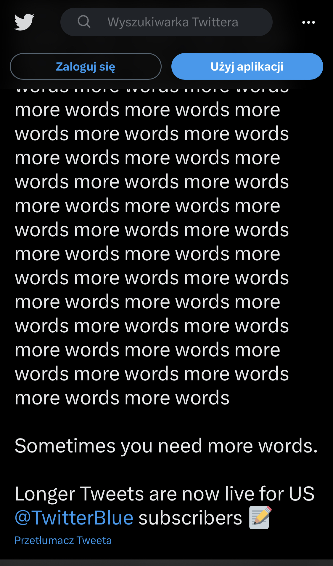 Niektórzy użytkownicy będą mieli możliwość publikowania dłuższych wpisów. Tweety do 4 tys. znaków mogą zamieszczać użytkownicy subskrypcyjnej usługi Twitter Blue, która jest dostępna już w 15 krajach. Obecnie limit znaków na darmowym koncie to 280 znaków w przypadku jednego wpisu.