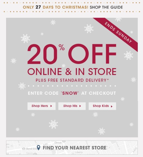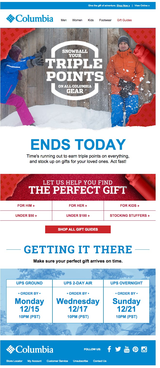 Szczególnie w okresie Bożego Narodzenia, konsument poszukuje najlepszych pomysłów na idealne prezenty. Zasypywany setkami ofert, musi dokonać wyboru. Co więc zrobić, aby kupił prezent właśnie w Twoim sklepie? Konsumenci, poza atrakcyjnymi cenowo ofertami, oczekują też zapewnienia, że zamówione przez nich prezenty dotrą do nich na czas, a także, w przypadku jakichkolwiek pytań czy wątpliwości, będą mogli liczyć na szybki kontakt z pracownikami sklepu. Warto więc zamieścić w newsletterze informacje o sposobach i terminach dostawy, maksymalnym dniu na złożenie zamówienia z gwarancją dostawy przed świętami, bezpośredni kontakt do opiekuna klienta, a w przypadku możliwości odbioru osobistego – adres najbliższego sklepu stacjonarnego.