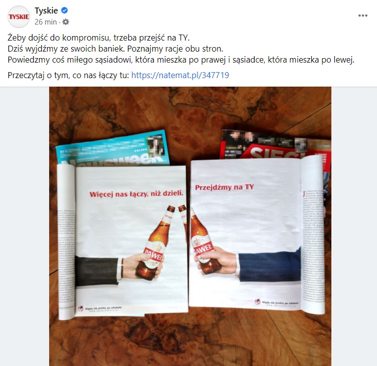 W ramach kampanii marka wykupiła przestrzeń reklamową w znanych z odmiennych poglądów politycznych tygodnikach „Newsweek” i „Sieci” i opublikowała w każdym z nich połowę reklamy. Po złączeniu, odbiorca widzi całość – dłonie stukające się butelkami z imionami: Paweł i Gaweł. W ten sposób, nawiązując do bajki Aleksandra Fredry, Tyskie chce zwrócić uwagę, że „Więcej nas łączy niż dzieli”. Reklamy ukazały się w wydaniach tygodników dostępnych na rynku od poniedziałku 19 kwietnia.