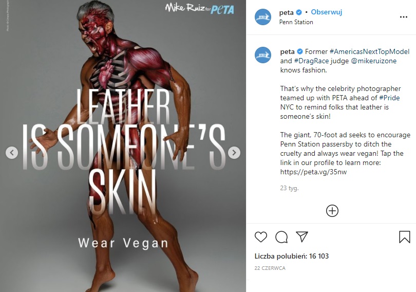 PETA, znana ze swoich dalekich od subtelności kampanii na rzecz zwierząt, nieraz apelowała o zaprzestanie używania skóry naturalnej w branży mody. Kilka miesięcy temu organizacja ruszyła z kampanią, która obejmowała billboardy uświadamiające, że materiały naturalne to „czyjaś skóra”.