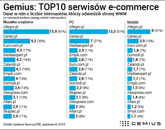 Liderem rankingu popularności serwisów e-commerce w Polsce jest Allegro.pl. Miesięcznie odwiedza je blisko 16 mln użytkowników sieci (61 proc. zasięgu wśród internautów). Na drugim miejscu zestawienia uplasowała się porównywarka cen Ceneo.pl z 9,2 mln internautów (35 proc.). Ostatnie miejsce na podium zajmuje sklep online ze sprzętem elektronicznym Euro.com.pl, należący do sieci RTV Euro AGD ─ 4,3 mln (17 proc). Kolejne miejsca w rankingu TOP10 zajęły: Mediaexpert.pl ─ 4,2 mln (16 proc.), Zalando.pl ─ 4,1 mln (16 proc.), Empik.com ─ 4 mln (15 proc.), Domodi.pl ─ 3,6 mln (14 proc.), Aliexpress.com ─ 3,1 mln (12 proc.), Allani.pl ─ 2,9 mln (11 proc.), oraz Skapiec.pl ─ 2,9 mln (11 proc.).