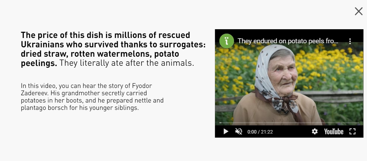 W ramach projektu powstała fikcyjna restauracja o nazwie „Uncounted since 1932”. Na stronie inicjatywy umieszczone zostało „menu” lokalu, w którym znajdziemy m.in. gotowane obierki ziemniaków, mieloną korę dębową, czy też placki z mąki, kory brzozowej i wody – to właśnie tego typu posiłki spożywali mieszkańcy Ukrainy podczas Wielkiego Głodu.