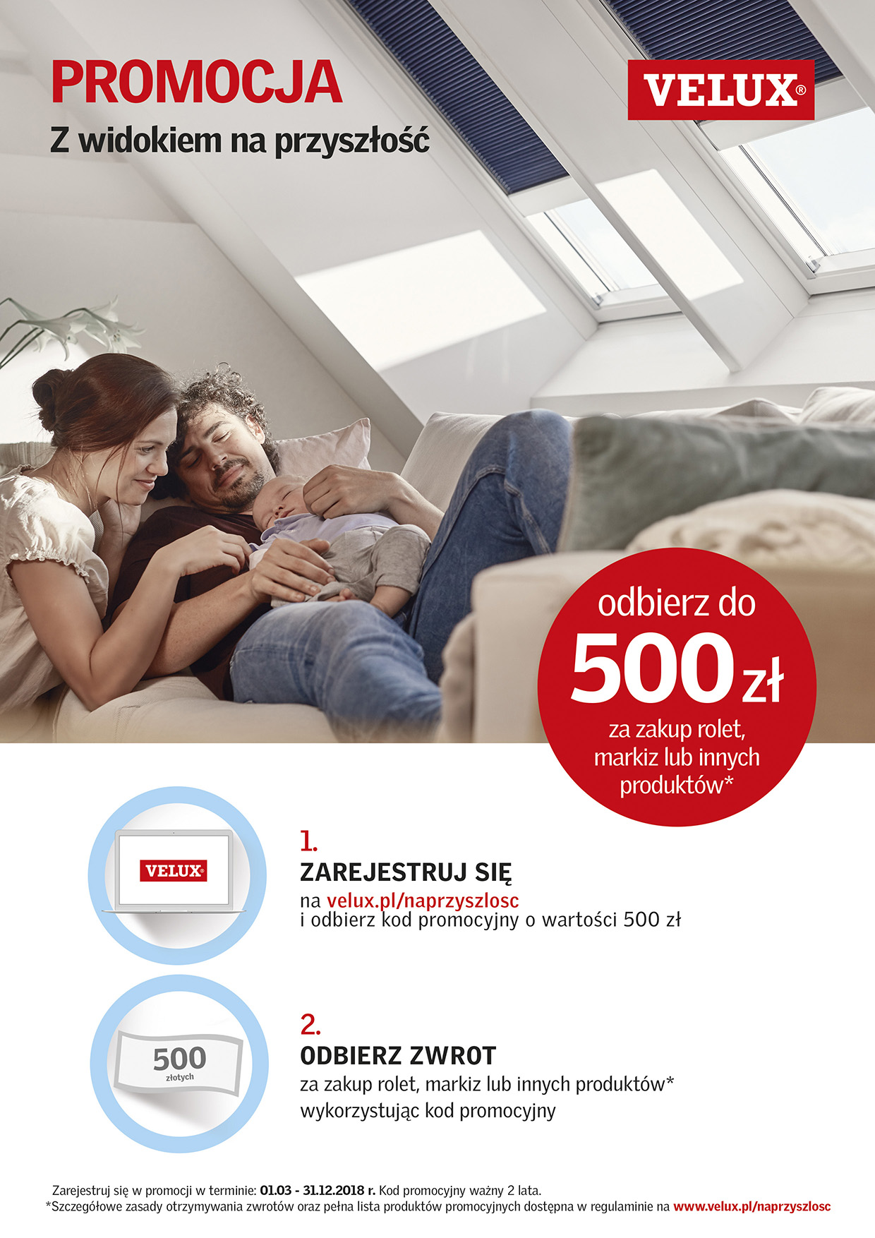 „Promocja z widokiem na przyszłość” – to hasło najnowszej edycji promocji konsumenckiej VELUX. Celem prowadzonej akcji promocyjnej jest zwiększenie sprzedaży produktów marki VELUX i ich widoczności na rynku, a także zachęcenie konsumentów do sięgnięcia po produkty firmy w punktach sprzedaży. Rejestracje do promocji przyjmowane są od 1 marca do 31 grudnia 2018 roku.