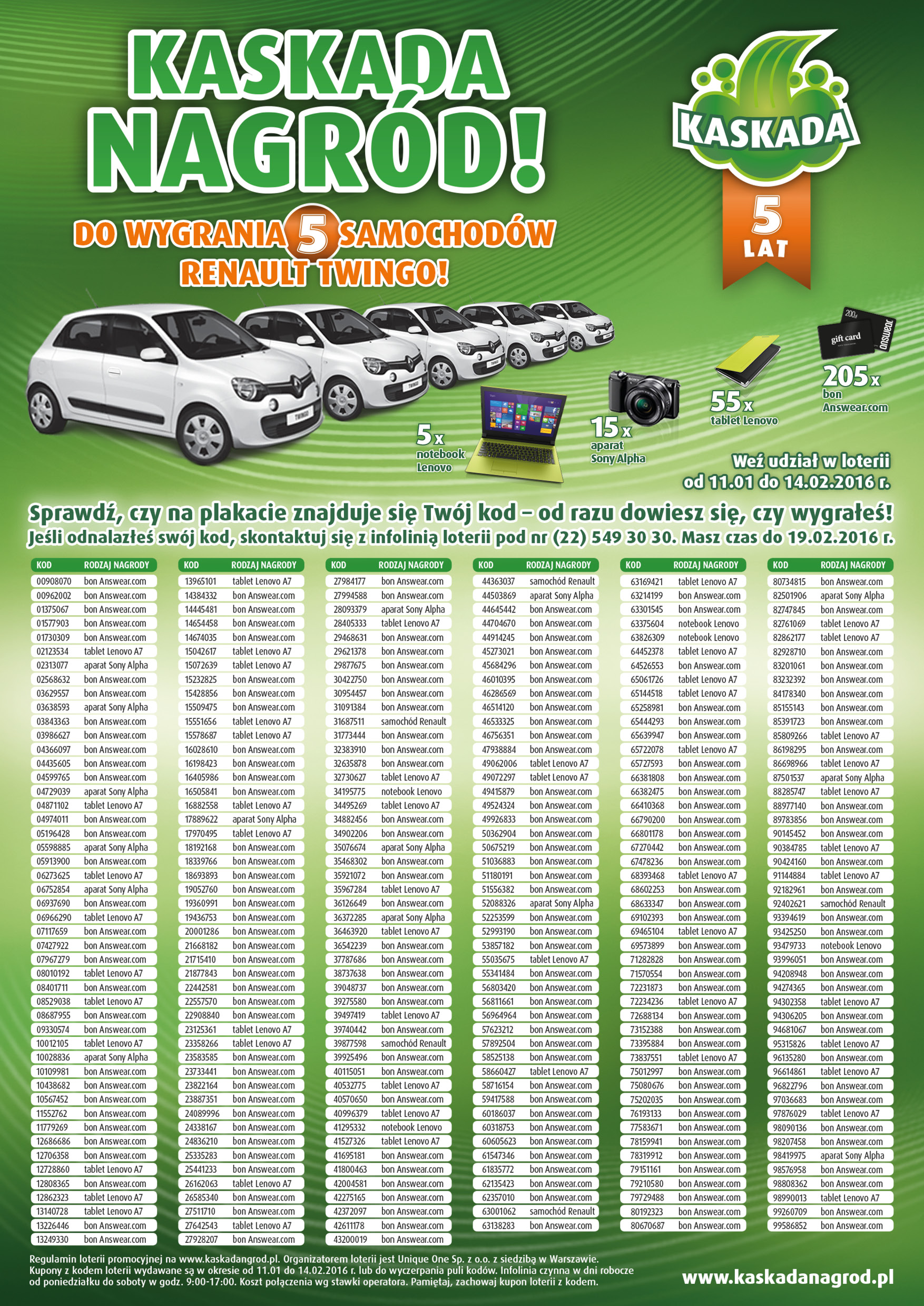 Loteria ma charakter typu instant-win, czyli grający od razu dowiaduje się, czy wygrał. Aby wziąć udział w loterii należy kupić Kaskadę i odebrać los połączony z kuponem loterii wraz z kodem. Następnie trzeba sprawdzić swój kod na plakacie, ulotce w kolekturze lub na stronie kaskadanagrod.pl. Głównymi w nagrodami w loterii jest pięć samochodów osobowych Renault Twingo. Do wygrania jest także tablet Lenovo (5 sztuk), aparat fotograficzny Sony Alpha (15 sztuk), tablet Lenovo (55 sztuk) i bon podarunkowy do sklepu Answear.com o wartości 200 zł każdy (205 sztuk).