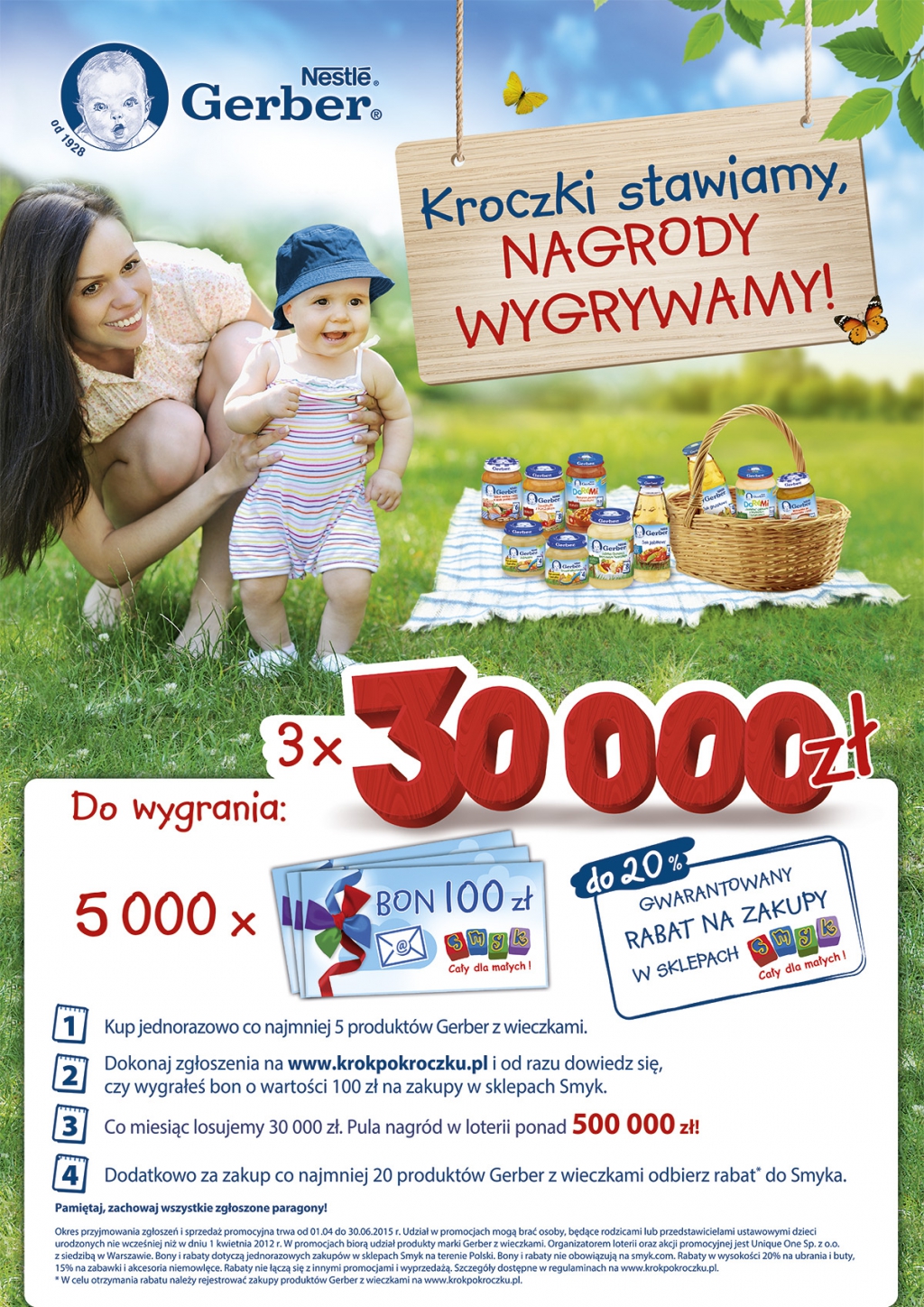 Aby wziąć udział w loterii, należy w okresie od 1 kwietnia 2015 r. do 30 czerwca 2015 r. kupić co najmniej 5 produktów Gerber z wieczkami potwierdzonych jednym paragonem, który należy zachować i zgłosić na stronie. Natomiast do wzięcia udziału w akcji ZBIERAJ RABATY niezbędny jest zakup co najmniej 20 produktów Gerber z wieczkami. W tym przypadku może on być udokumentowany na kilku paragonach. Paragony kolekcjonuje się na stronie promocyjnej. W tym celu należy założyć konto (jednorazowo w czasie trwania akcji) na stronie i dodawać paragony. Dzięki temu uczestnik ma możliwość logowania się, dokonywania zgłoszeń produktów Gerber z wieczkami oraz sprawdzania stanu swojego konta, w tym m.in. ilości przyznanych mu rabatów. Warto zaznaczyć, że jeden paragon z udokumentowanym zakupem pięciu (lub więcej) produktów Gerber z wieczkami może wziąć udział zarówno w loterii jak i w akcji ZBIERAJ RABATY.