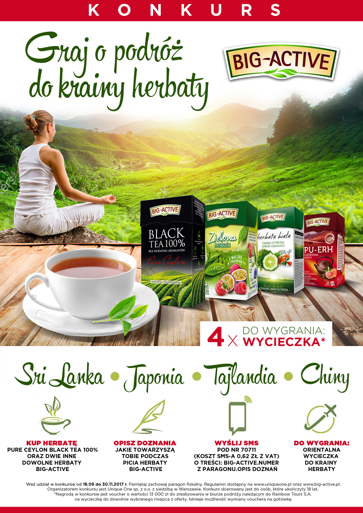 Konkurs rozpoczął się 18 września i potrwa do 30 listopada 2017 roku. Aby wziąć udział w konkursie, należy kupić jednorazowo herbatę Pure Ceylon Black Tea 100 % oraz dwie inne dowolne herbaty BIG-ACTIVE, opisać doznania jakie towarzyszą piciu herbaty BIG-ACTIVE, a następnie dokonać zgłoszenia wysyłając SMS pod numer 70 711, w treści wpisując: BIG-ACTIVE.numer z paragonu.opis doznań (koszt SMS’a wynosi 0,62 zł z VAT). Należy zachować paragon fiskalny. Konkurs skierowany jest do osób, które ukończyły 18 lat. Do wygrania jest jedna z czterech wycieczek: na Sri Lankę, do Japonii, Tajlandii i Chin. Wycieczkę można zrealizować w biurze podróży Rainbow Tours S.A. Istnieje także możliwość wymiany vouchera na gotówkę.