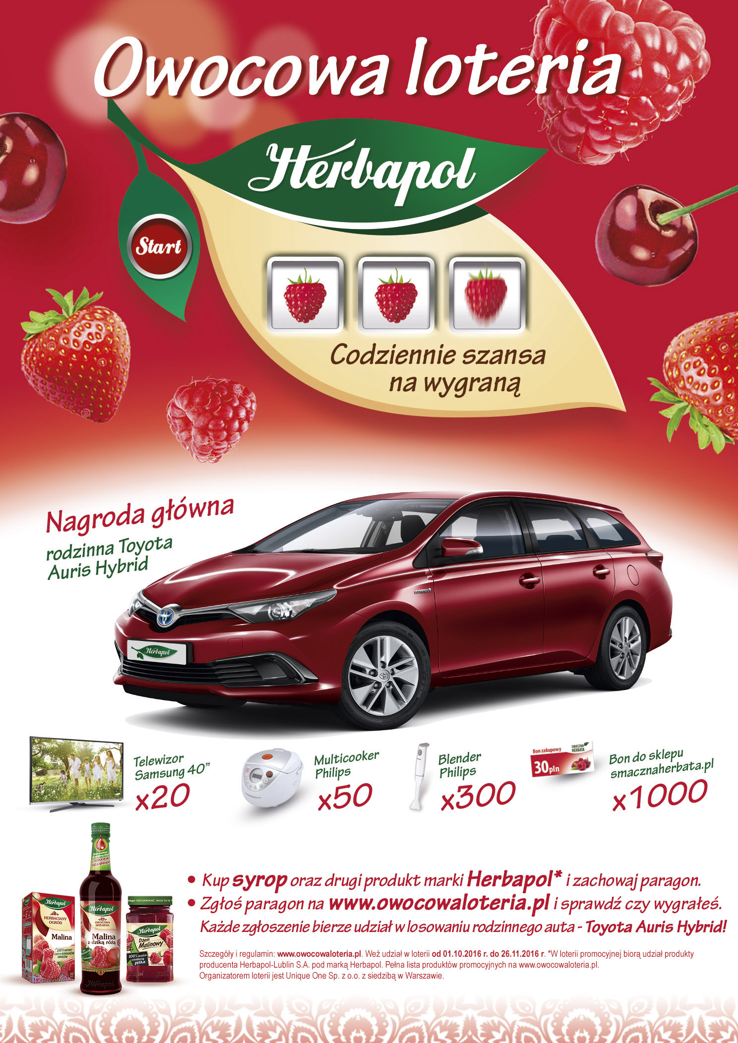 Loteria rozpoczęła się 1 października i potrwa do 26 listopada 2016 roku. Ma ona charakter typu instant-win, czyli uczestnik od razu dowiaduje się, czy wygrał. Aby wziąć udział w loterii należy kupić jednorazowo syrop marki Herbapol oraz drugi dowolny produkt producenta Herbapol-Lublin S.A. pod marką Herbapol, a następnie dokonać zgłoszenia na stronie www.owocowaloteria.pl i sprawdzić, czy wygrało się jedną z ponad 1300 nagród (20 telewizorów Samsung, 50 multicookerów Philips, 300 blenderów Philips, 1000 bonów o wartości 30 zł do sklepu smacznaherbata.pl). Należy zachować paragon, ponieważ każde zgłoszenie bierze udział w finałowym losowaniu rodzinnego auta Toyota Auris Hybrid na zakończenie loterii.