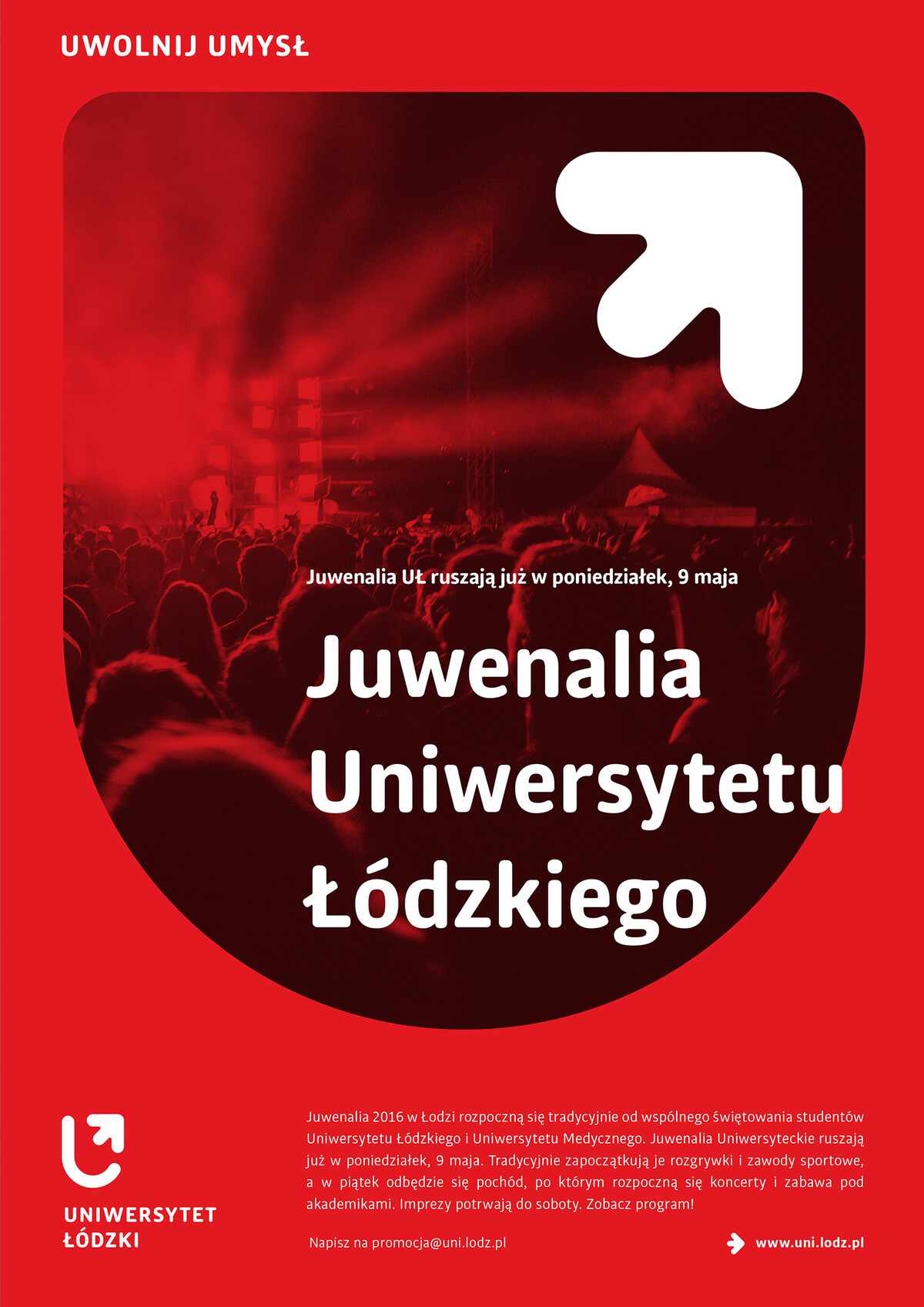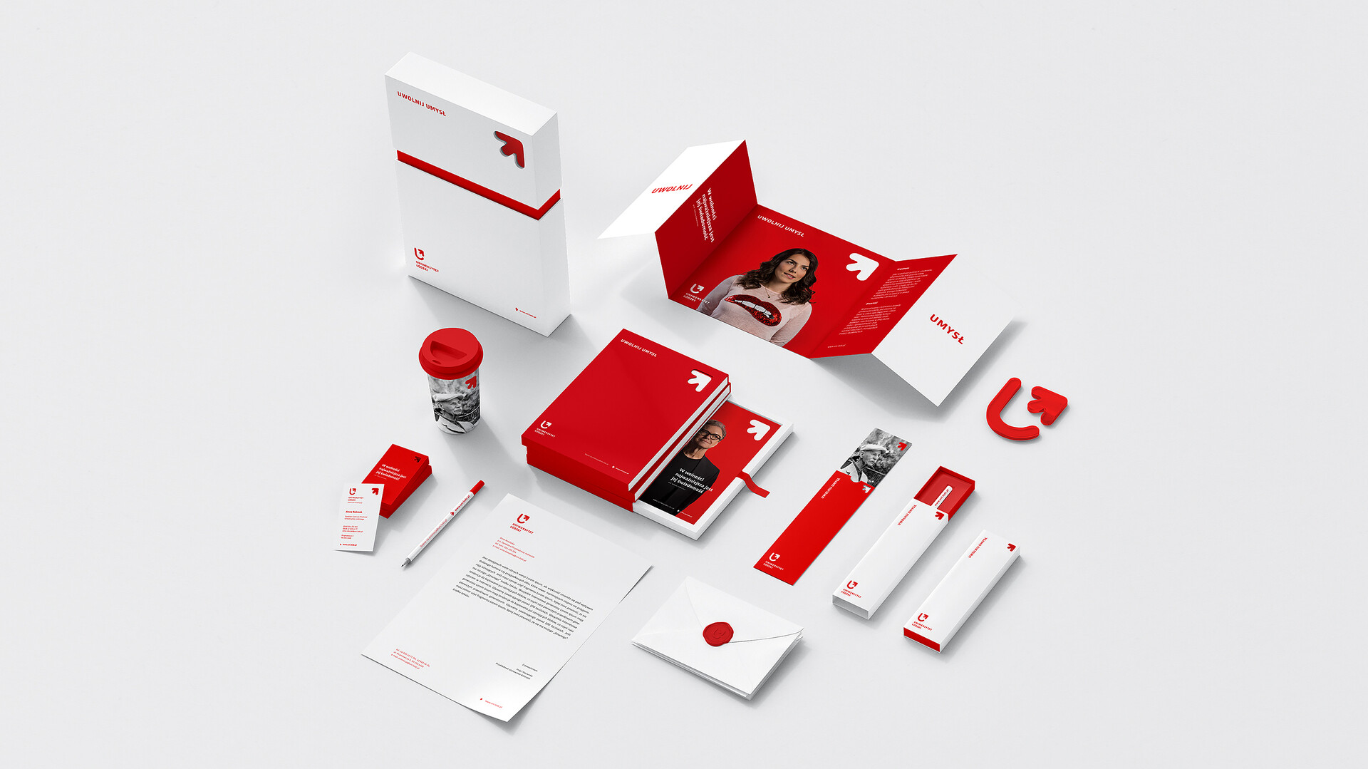 Bardziej podoba mi się starszy projekt (2016 rok) dla Łodzi w wykonaniu Ortografii. Uczelnia zdecydowała się na minimalistyczny kierunek w kolorystce czerwień-biel-szarość. Nowe logo Uniwersytetu Łódzkiego składa się z sygnetu, który tworzą litera U oraz strzałka, którą można też czytać jako odwróconą literę Ł. Oczywiście znaczeń jest tu wiele – strzałka oznacza rozwój, a całe logo przyjmuje kształt tarczy herbowej.