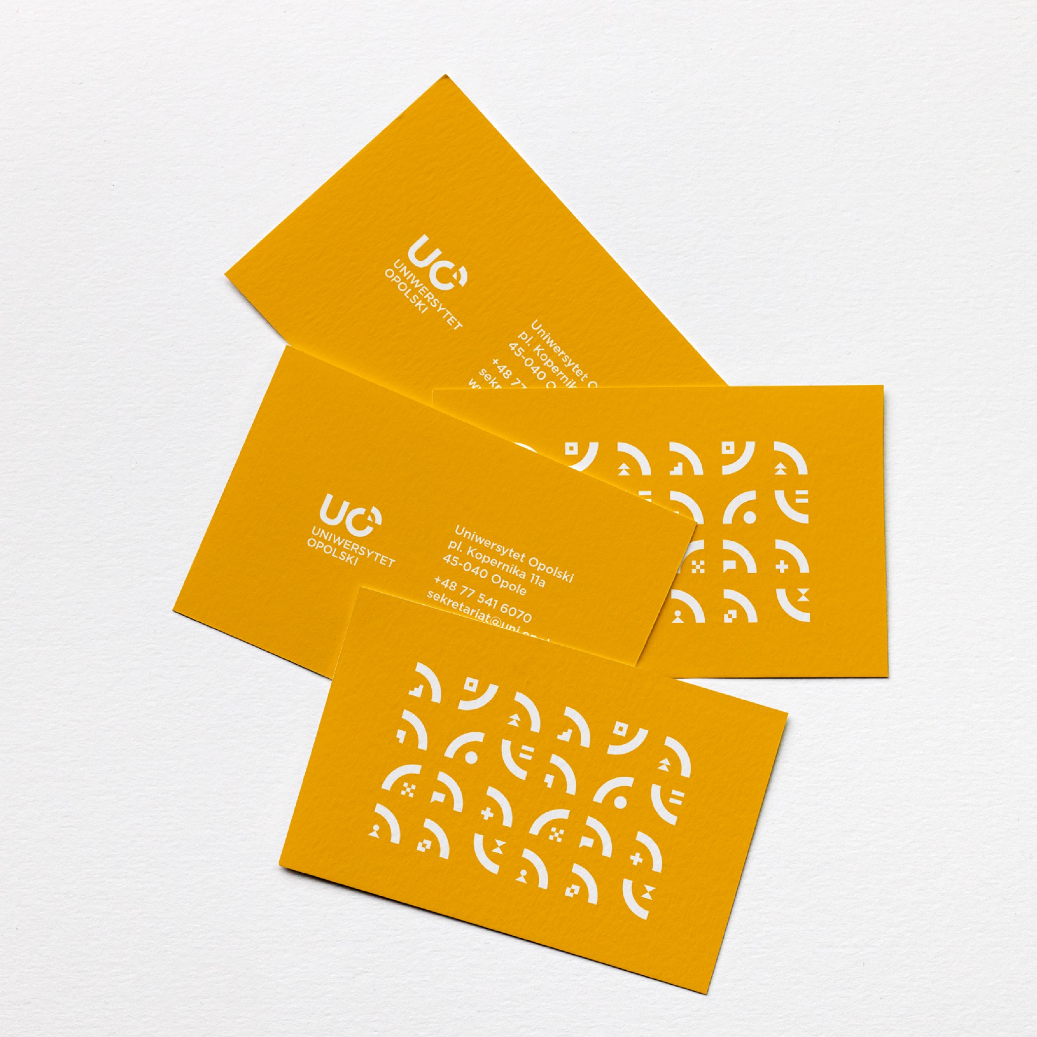 Rebranding objął także znaki identyfikujące wszystkie 12 wydziałów – widzimy, że w każdym z nich pojawia się łuk znany z głównego logo instytucji. Motyw został również wykorzystany jako pattern na wizytówkach na gadżetach firmowych. Kierunek uważam za dobry, ale jednak czuję niedosyt, jeśli chodzi o wykonanie i potencjał pomysłu.