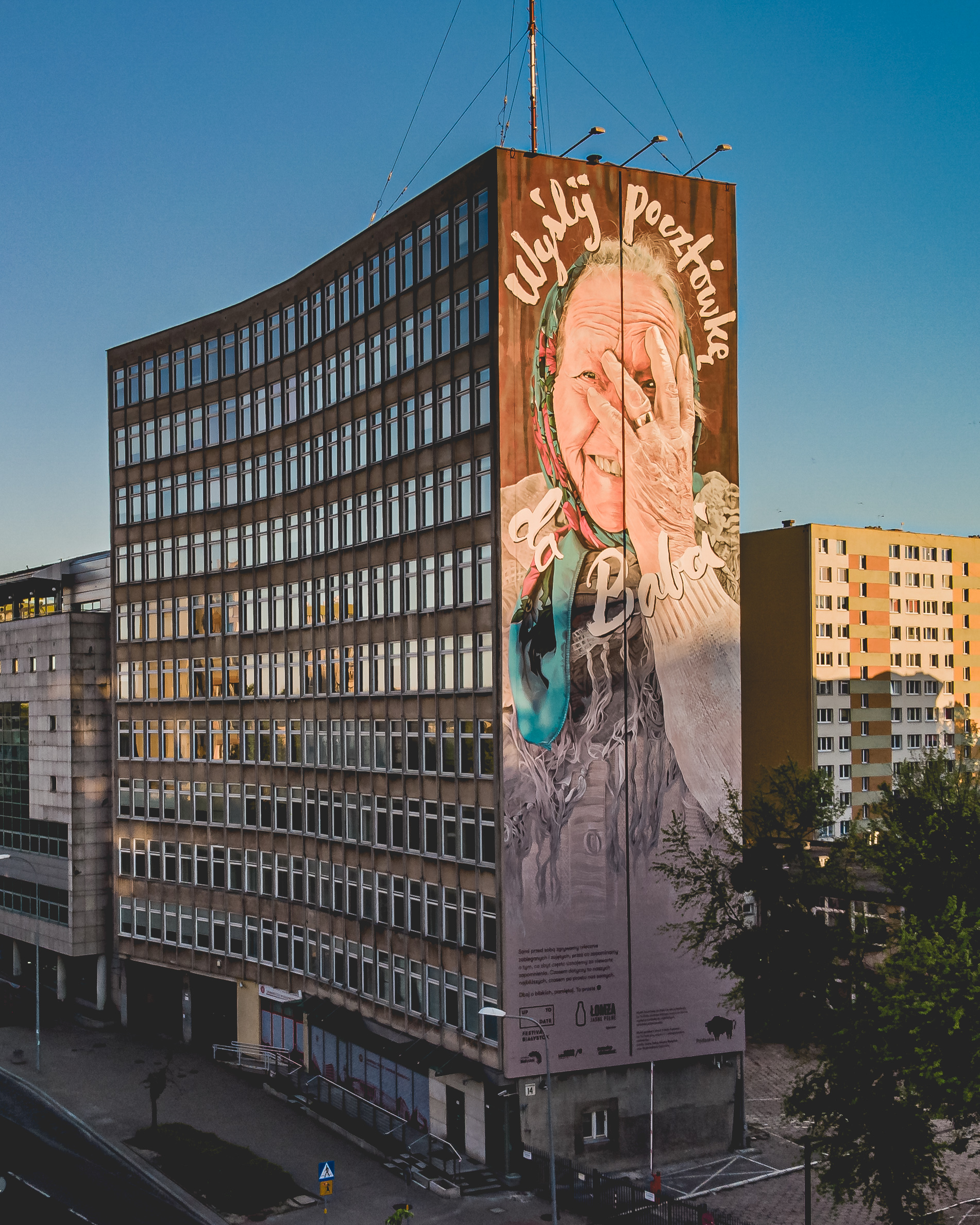 Mural przedstawia gigantycznych rozmiarów portret, znanej z wcześniejszego spotu promującego festiwal Up To Date, Babci Eugenii i poprzez komunikat przypomina o akcji społecznej festiwalu „Wyślij Pocztówkę do Babci”. Mural zdobi tekst, którego celem jest zwrócenie uwagi na główny przekaz malowidła: „Sami przed sobą zgrywamy wiecznie zabieganych i zajętych, przez co zapominamy o tym, co zbyt często uznajemy za niewarte zapomnienia. Czasem dotyczy to naszych najbliższych, czasem po prostu nas samych. Dbaj o bliskich, pamiętaj. To proste”.