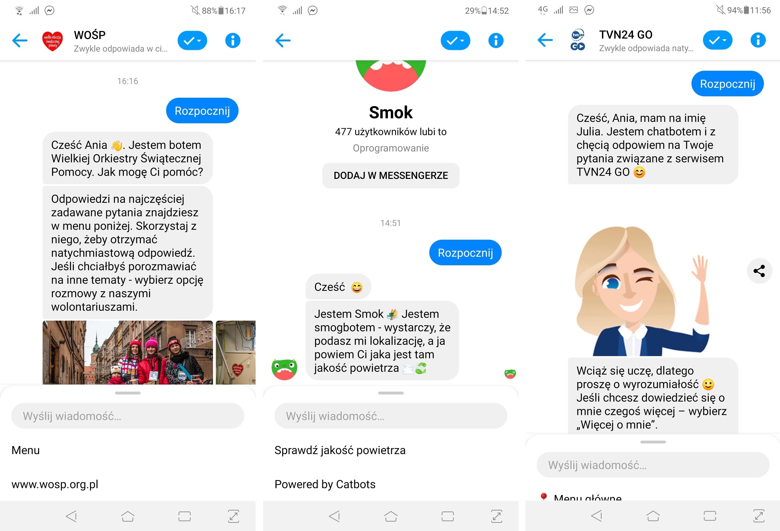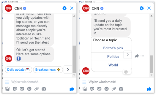 Jeśli chodzi o ułatwienie korzystania z chatbota, to dobry przykład mogą stanowić chatboty na Messengerze, które umożliwiają użytkownikowi wybór opcji za pośrednictwem przycisków. Są one wyróżnione graficznie i niektóre nawet opatrzone piktogramami (emoji), które pasują do kontekstu czatu i ułatwiają wybór odpowiedniej opcji. Co do Messengera, jako środowiska dla botów, jest on odbierany pozytywnie przez użytkowników. Jest to medium, które jest im dobrze znane, a ponadto umożliwia powrót do prowadzonej wcześniej rozmowy (rozmowy się zapisują), co stanowi dużą zaletę.