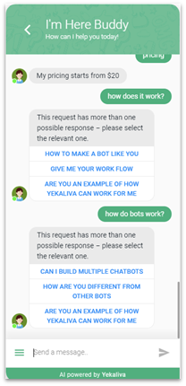 Przykładem dobrej praktyki, która może rozwiązać powyższe problemy jest chatbot firmy Yekaliva. W sytuacji, gdy dla bota nie jest klarowne o co pyta użytkownik, zamiast prosić go o samodzielne doprecyzowanie, bot podaje kilka gotowych pytań/tematów. Dzięki temu użytkownik nie musi zastanawiać się jak przeformułować pytanie, by było zrozumiałe dla bota i może otrzymać precyzyjną odpowiedź.