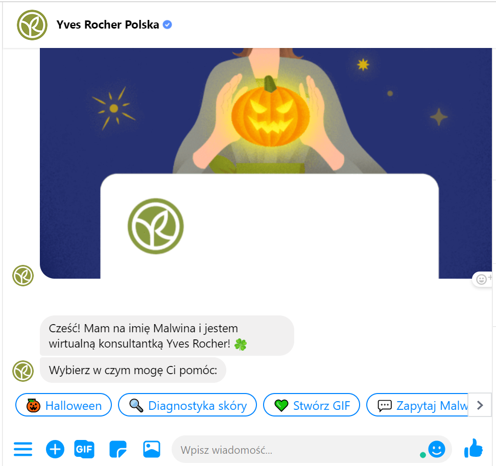 Dlatego warto, by pierwsza wiadomość od chatbota pojawiała się dopiero po rozpoczęciu interakcji ze strony użytkownika (np. po kliknięciu na przycisk „Rozpocznij”). Poniżej przykłady chatbotów, które przedstawiają się dopiero po nawiązaniu rozmowy przez użytkownika.