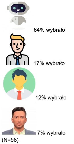 Jak wynika z przeprowadzonych przez nas badań ilościowych użytkownicy w większości preferują wizerunek przedstawiający robota. Pokrywa się to także z odpowiedziami użytkowników w pokoju badawczym RespoTeam. Należy jednak pamiętać, by wizerunek robota był przyjazny. Niejednokrotnie podczas naszych badań zdarzało się, że gdy użytkownikowi nie podobał się awatar robota i nie miał do niego zaufania, to nie rozpoczynałby z nim w ogóle rozmowy. Pojawiały się nawet obawy o phishing.