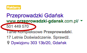 Kolejne bardzo przydatne rozszerzenie. Pozwala ono już w tekście reklamy wyświetlić numer telefonu twojej firmy. Ma to zastosowanie zwłaszcza w przypadku reklamy mobilnej, gdzie wystarczy jedno kliknięcie, aby klient do ciebie zadzwonił. Rozszerzenia połączeń sprawdzają się doskonale w firmach, które realizują jakąś nagłą potrzebę klienta, np. taxi, holowanie itp.