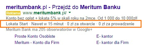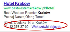 Rozszerzenie, które powinna dodać każda firma, dla której kluczowe znaczenie ma miejsce jej działalności, tutaj np. restauracje, hotele, sklepy osiedlowe. Dzięki rozszerzeniu lokalizacji klient od razu widzi, czy wyszukana reklama spełnia jego potrzeby. Redukuje to liczbę pomyłkowych kliknięć.