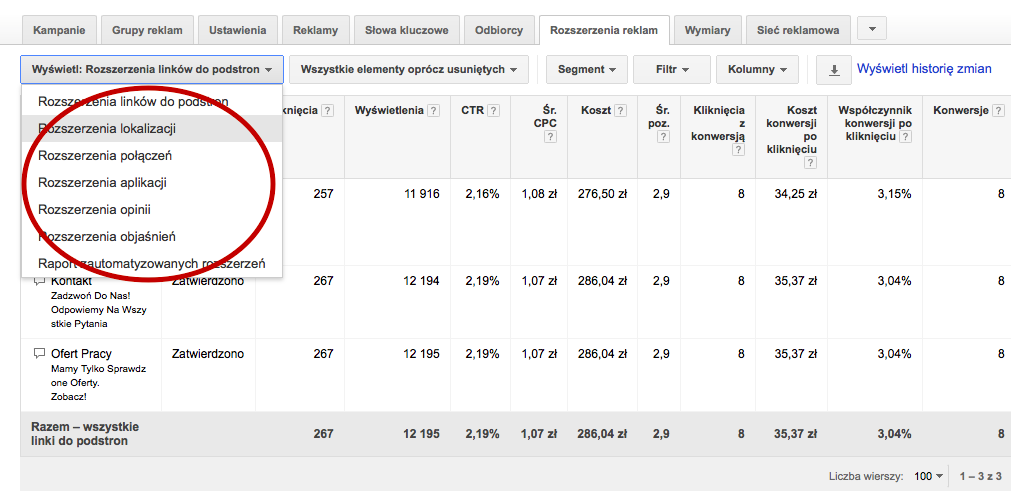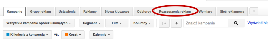 Aby ustawić rozszerzenia należy wejść na koncie Google AdWords do zakładki Rozszerzenia reklam.