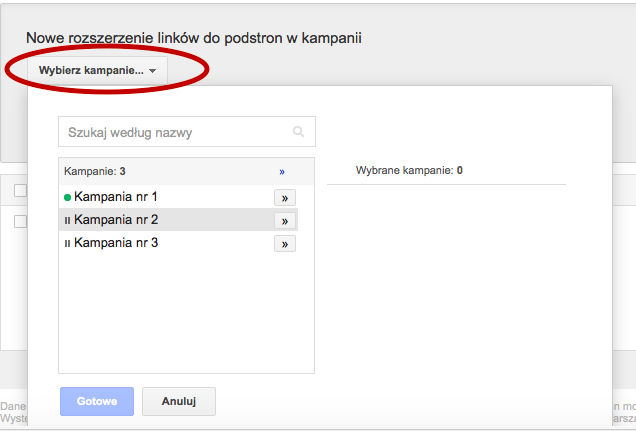 Tutaj wybieramy kampanie, do której chcemy utworzyć rozszerzenie i zatwierdzamy przyciskiem Gotowe. Rozszerzenia objaśnień dodaje się na poziomie całego konta.