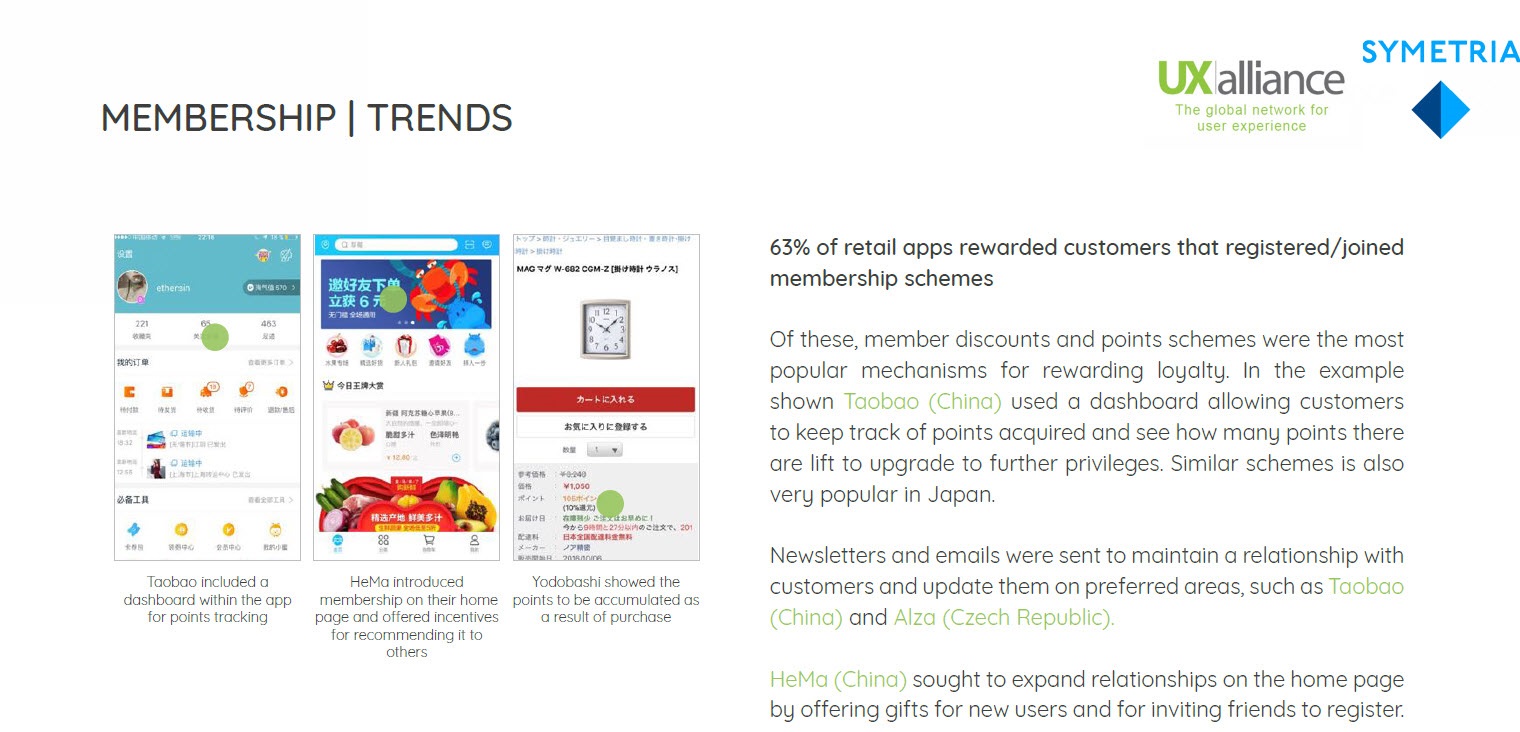 Te ostatnie są ulubionymi nagrodami w krajach azjatyckich (Chiny i Japonia), przy czym warto zaznaczyć, że użytkownik jest stale informowany o posiadanej liczbie punktów – jest ona wyświetlana na pulpicie w bezpośrednim sąsiedztwie kolejnych poziomów możliwych od osiągnięcia. Z kolei HeMa (Chiny) nagradza upominkami nowych użytkowników, a także tych, którzy zarekomendują przystąpienie do programu. Informacja jest umieszczona na stronie głównej.