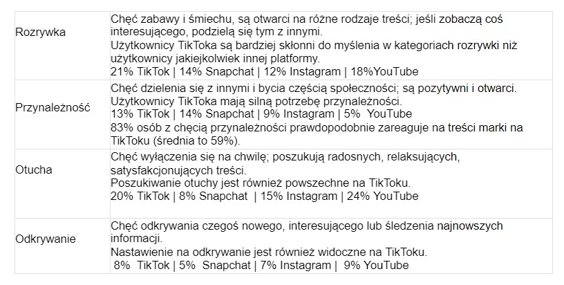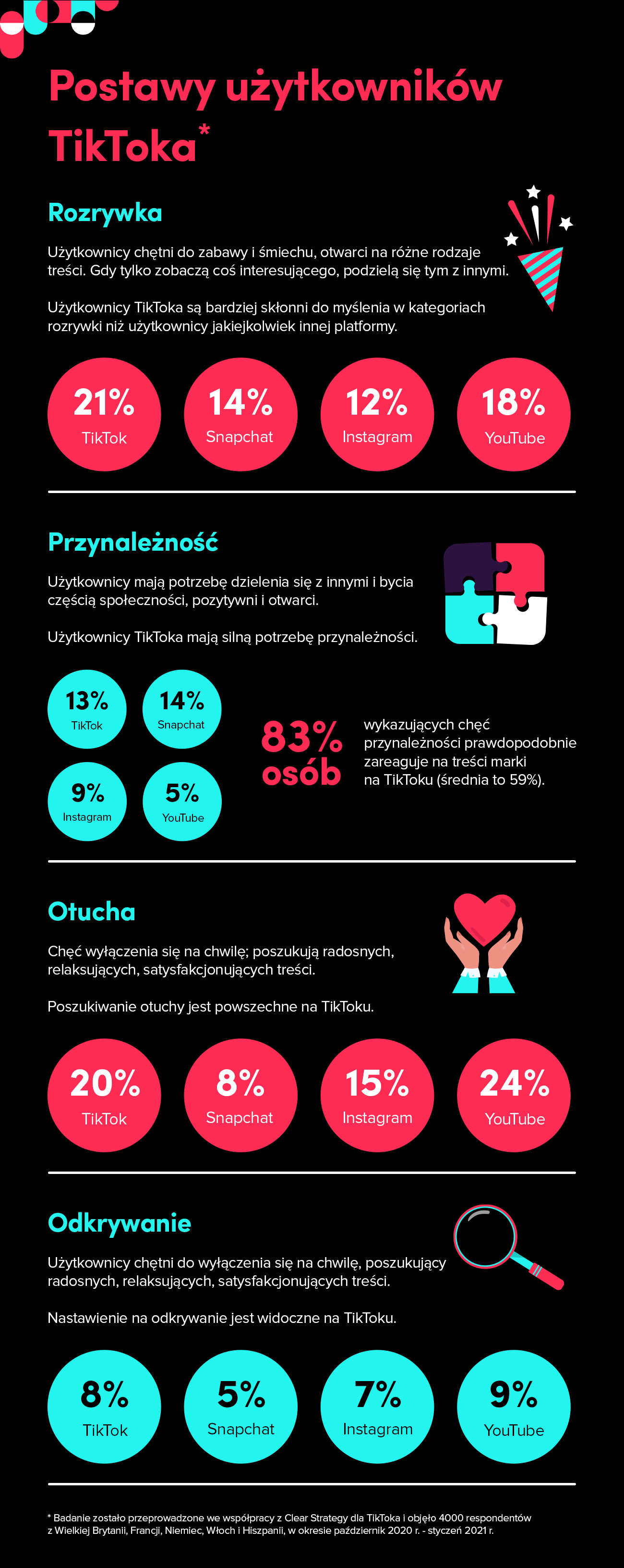 - Wśród użytkowników TikToka dominują cztery podstawowe sposoby myślenia związane z chęcią rozrywki, przynależności, otuchy i odkrywania.