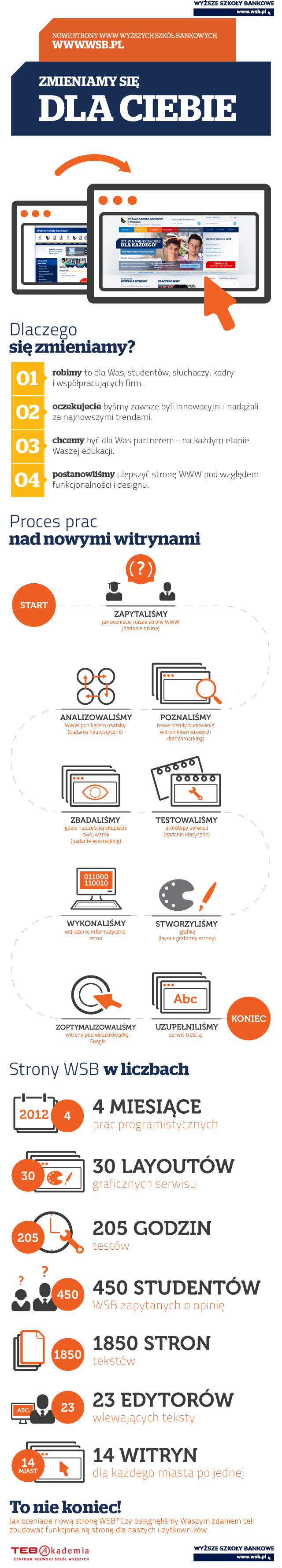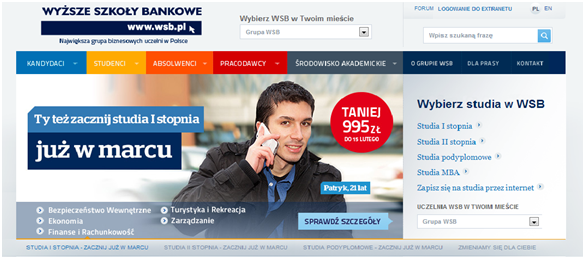 Wyższe Szkoły Bankowe to grupa renomowanych niepublicznych uczelni biznesu, założonych przez Centrum Rozwoju Szkół Wyższych TEB Akademia sp. z o.o.. W skład grupy wchodzi 13 uczelni w całej Polsce. Symetria została wybrana przez firmę TEB Akademia do współpracy przy projekcie wymiany 14 witryn Wyższych Szkół Bankowych, odpowiadając za opracowanie funkcjonalności witryny, badania oraz przygotowanie layoutów graficznych, uwzględniających nową linię graficzną WSB. Wśród celów postawionych przed nowotworzonym serwisem uwzględniono zwiększenie konwersji , zaspokojenie potrzeb informacyjnych grup docelowych oraz eliminację błędów z obszaru usability.