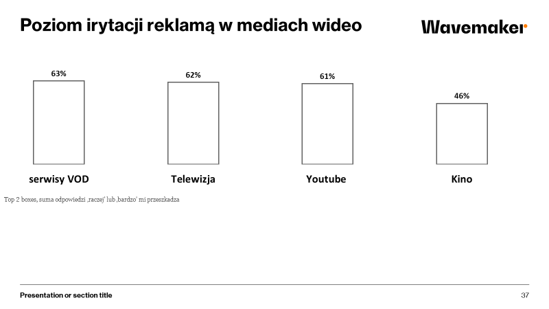 Irytacja reklamą w serwisach VOD osiągnęła rekordowy poziom, zrównując się poziomem z irytacją reklamą TV, pokazuje VideoTrack 5, cykliczne badanie agencji Wavemaker. 63% polskich widzów internetowych twierdzi, że reklama w serwisach z programami na żądanie raczej lub zdecydowanie im przeszkadza, co plasuje VOD na szczycie rankingu mediów wideo pod względem poziomu irytacji (choć różnice między TV, YT i VOD są nieznaczne).