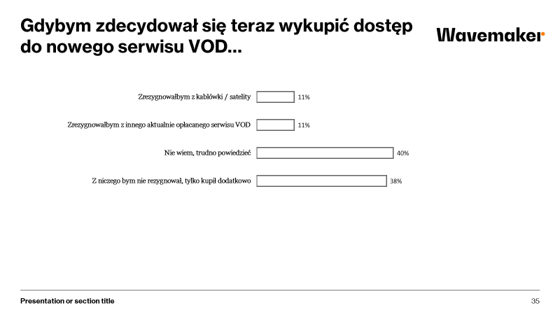 Co ciekawe, większość badanych, myśląc o ewentualnym zakupie kolejnego serwisu SVOD, nie bierze pod uwagę rezygnacji z innych posiadanych usług wideo. Tylko co dziesiąty badany mówi, że w takiej sytuacji anulowałby posiadaną już inną subskrypcję wideo lub zrezygnował z płatnej telewizji (cord-cutting).