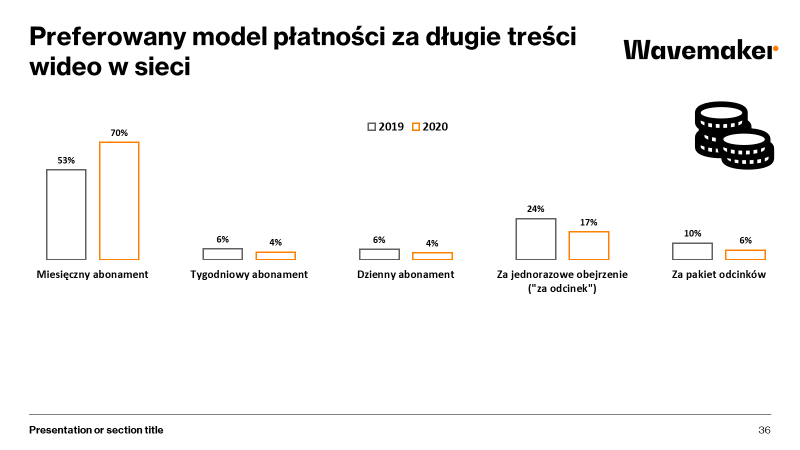 Płatne serwisy abonamentowe z wideo (Netflix, HBO Go, Player+ itp.) wyraźnie zmieniły w ostatnich latach preferencje polskich widzów względem płacenia za treści wideo. Abonament systematycznie wypiera inne formy płacenia za filmy i seriale, a obecnie już 7 na 10 widzów internetowych uważa go za optymalną formę rozliczania się za treści.