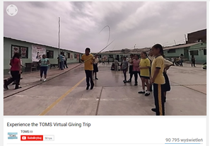 Jednym z najciekawszych sposobów na wykorzystanie wirtualnej rzeczywistości może pochwalić się marka obuwnicza Toms, która za pomocą tej technologii promowała prowadzoną przez siebie akcję CSR. Jednym z głównych założeń marki Toms jest pomoc potrzebującym. Za każdym razem, gdy klient kupuje produkt marki, producent finansuje zakup butów dla osób, które ich najbardziej potrzebują. Tym samym Toms nadaje społeczny wymiar zakupowi, docierając do klientów szczególnie zainteresowanych pomaganiem innym. By promować swoje wartości Toms zdecydował się przygotować wirtualną podróż do wioski w Peru i pokazać jak wolontariusze marki przekazywali potrzebującym buty. Wolontariusze nie tylko obdarowywali dzieci, ale także bawili się z nimi i rozmawiali, a klient uczestniczący wirtualnie w ich podróży miał szansę poczuć, że jest w środku wydarzeń. Dzięki temu mógł przekonać się, że marka rzeczywiście dba o realizowanie swoich celów i idei, a klienci rzeczywiście mają wpływ na zmianę świata na lepsze, poprzez swoje decyzje zakupowe.