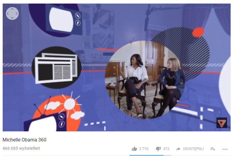 Virtual Reality to narzędzie przyszłości – trudno w to wątpić. Zaczynają dostrzegać to również politycy i osoby związane z życiem publicznym. Świetnie wykorzystała to Michelle Obama, która mając świadomość jak ważne jest zaciekawienie młodszego grona odbiorców, opublikowała wywiad dotyczący nowych technologii, który emitowany był za pomocą VR. Tym samym umożliwiła odbiorcom doświadczenie, które pozwalało na większe zaangażowanie w treści, które chciała im przekazać. Odbiorca miał poczucie, że siedzi w pokoju w Białym Domu i słucha wywiadu razem z innymi członkami ekipy filmowej. Unikalność tego przedsięwzięcia niewątpliwie zaciekawiła media i odbiorców, którzy obejrzeli film prawie 500 000 razy.