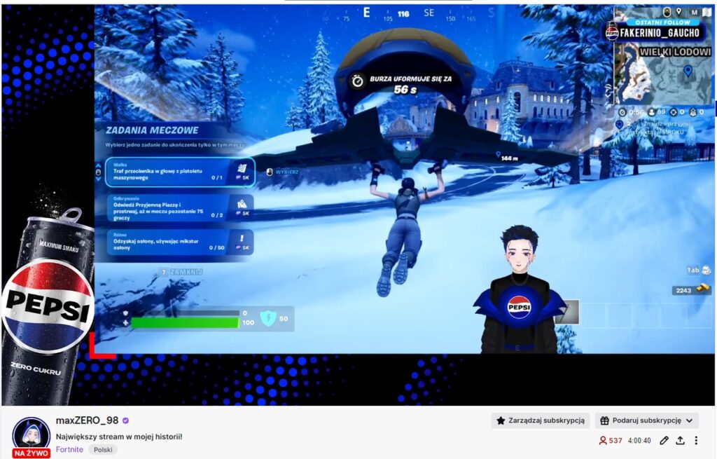 W ramach globalnej współpracy Epic Games oraz PepsiCo powstała specjalna mapa w Fortnite, na której pojawił się nowy branding marki Pepsi. To właśnie w Fortnite odbyła się kluczowa rozgrywka Vtubera Zero z Nieuczesaną, Awizo, Slayproxxem i BlackFireIce. Plan rozgrywki podzielony był na 4 rundy, w trakcie których  prowadzącym był Zero, a pozostali streamerzy mieli za zadanie ukryć się na mapie. Po dwóch rozgrywkach do gry Zero ze streamerami dołączyli już widzowie.