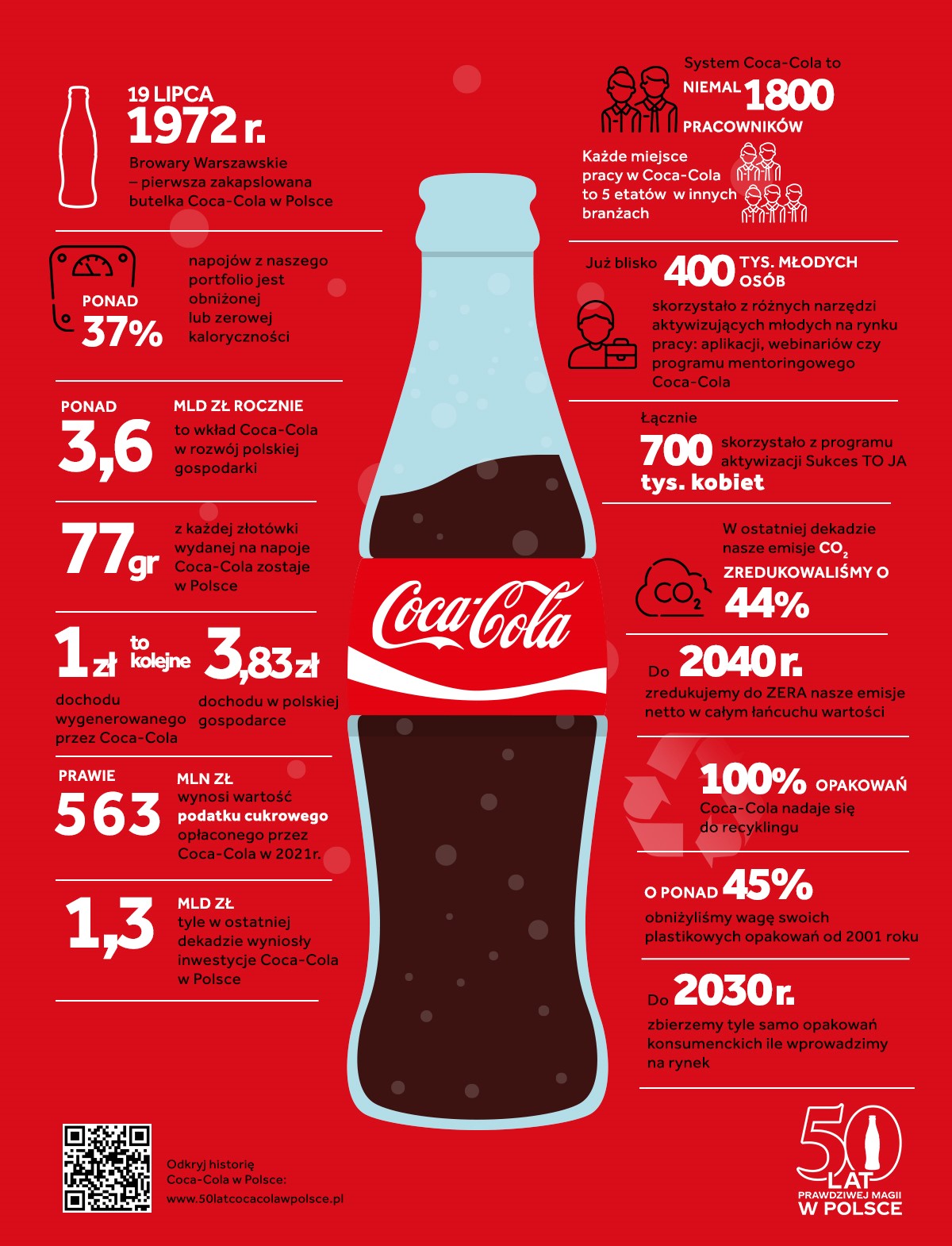 Od 19 lipca 1972 roku, kiedy zakapslowano pierwszą butelkę Coca-Cola w Browarach Warszawskich (wtedy były to Warszawskie Zakłady Piwowarskie), zmieniło się wiele – ale nie legendarny smak napoju. To on przez dekady inspirował polskich artystów. Już w 1974 roku o Coca-Cola śpiewała Halina Frąckowiak w piosence „Bądź gotowy dziś do drogi”.