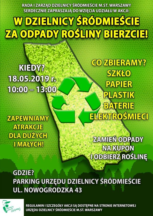Warszawski Urząd Dzielnicy Śródmieście rusza z nietypową akcją, której celem jest ochrona naszego środowiska. W ramach specjalnej eko wymiany odpady takie jak szkło, papier, plastik, baterie oraz elektrośmieci będzie można wymienić na kupon i odebrać sadzonkę rośliny.
