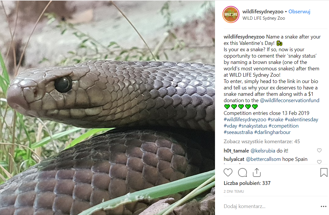 Z kolei ZOO w Sydney w Australii w ramach Walentynek oferuje nadawanie wężom imion swoich byłych partnerów.