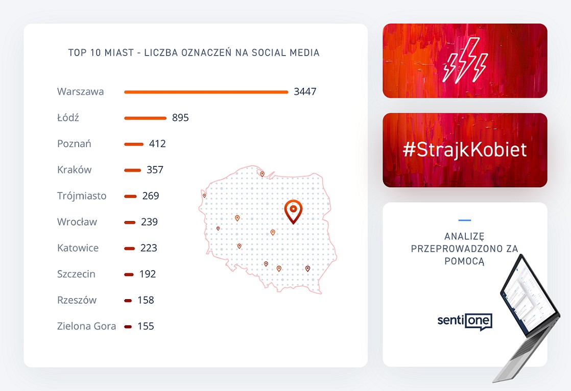 Nie jest zaskoczeniem, że największe zainteresowanie protestami widać było w dużych miastach. Jak wynika z monitoringu Internetu przeprowadzonego przez SentiOne, w Warszawie w mediach społecznościowych w styczniu zameldowało się 3447 osób, używając jednocześnie sformułowań „protest kobiet”, „strajk kobiet”, „to jest wojna”, „wypierdalać” czy „czarny protest”. Na drugim miejscu znalazła się Łódź, w której zameldowało się już tylko 895 osób, na trzecim Poznań – 412 osób, a na czwartym Kraków – 357 osób.