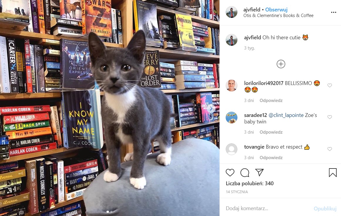 Jakiś czas temu właścicielka lokalu zaczęła przygarniać bezdomne koty, a Otis & Clementine’s Books & Coffee służyło chwilowo jako ich dom tymczasowy. Klientom jednak tak spodobała się obecność pupili, że niektórzy z nich postanowili je zaadoptować.
